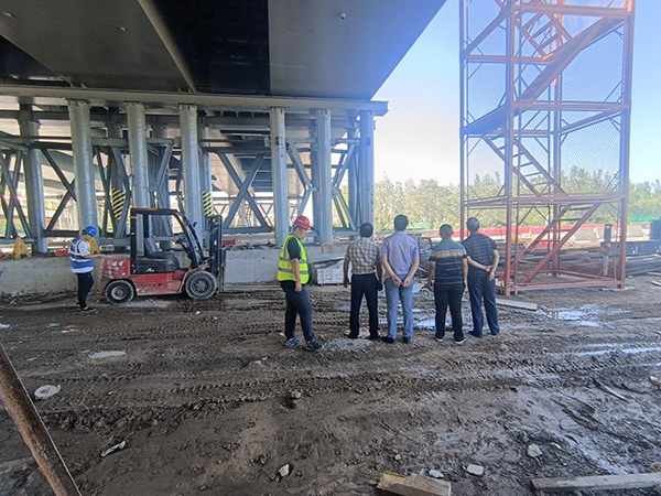 檢查組一行首先深入104跨線橋施工現(xiàn)場,分別對鋼混疊合梁AB段右幅頂板鋼筋綁扎情況及橋梁墩柱外觀質(zhì)量進行一一檢查,檢查組提出,綁扎鋼筋時要注意施工安全,正確佩戴防護,同時要注重施工細節(jié)處理,對橋梁抹面進行精細打磨,保證其平整度滿足驗收要求。
