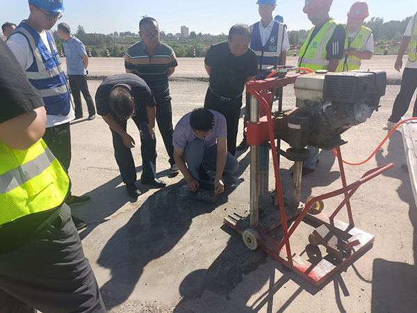 隨后行至跨線橋與高速匝道連接路,為檢測出水穩(wěn)層的厚度、抗壓強度、完整性、密實性等數(shù)據(jù)指標,現(xiàn)場采用鉆芯機鉆取了芯樣,通過查看芯樣結(jié)構(gòu)是否完整,檢測芯樣厚度是否達標,并記錄數(shù)據(jù),判斷是否達到設(shè)計要求。經(jīng)實測,厚度和壓實度基本符合設(shè)計要求。