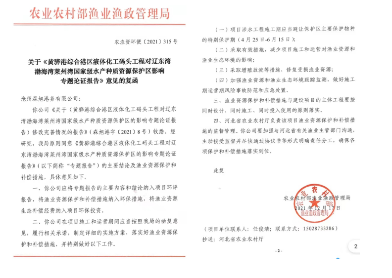 近日,《黃驊港綜合港區(qū)液體化工碼頭工程對(duì)遼東灣渤海灣萊州灣國(guó)家級(jí)水產(chǎn)種質(zhì)資源保護(hù)區(qū)影響專題論證報(bào)告》取得了農(nóng)業(yè)農(nóng)村部的批復(fù)。農(nóng)業(yè)農(nóng)村部批復(fù)的取得加快了液體化工碼頭工程項(xiàng)目前期手續(xù)跑辦的進(jìn)度,為項(xiàng)目開工建設(shè)奠定了堅(jiān)實(shí)基礎(chǔ)。
