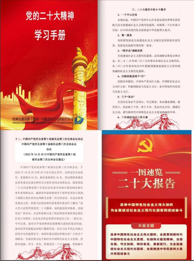 系統(tǒng)性、規(guī)范性與理論性、科學(xué)性融為一體的“必修教材”是貫徹落實黨的二十大會議精神的重要載體,針對當(dāng)前黨員學(xué)習(xí)形式趨向“碎片化”、“移動式”的特點,為緩解因工作生活節(jié)奏的加快而產(chǎn)生“工學(xué)”矛盾,津汕分公司精心設(shè)計、認(rèn)真籌劃,制作了電子口袋書《黨的二十大精神學(xué)習(xí)手冊》,電子學(xué)習(xí)手冊內(nèi)容豐富,易讀易懂,涵蓋了黨的二十大報告全文與解讀、習(xí)近平同志的重要講話、新黨章以及津汕分公司各支部學(xué)習(xí)二十大精神紀(jì)實等內(nèi)容。