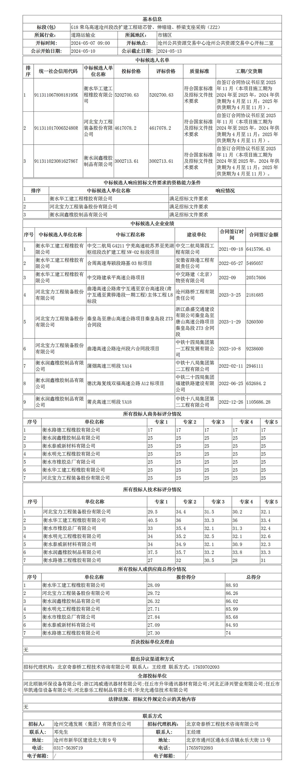 G18榮烏高速滄州段改擴(kuò)建工程硅芯管、伸縮縫、橋梁支座采購(gòu)(ZZ2)中標(biāo)候選人公示