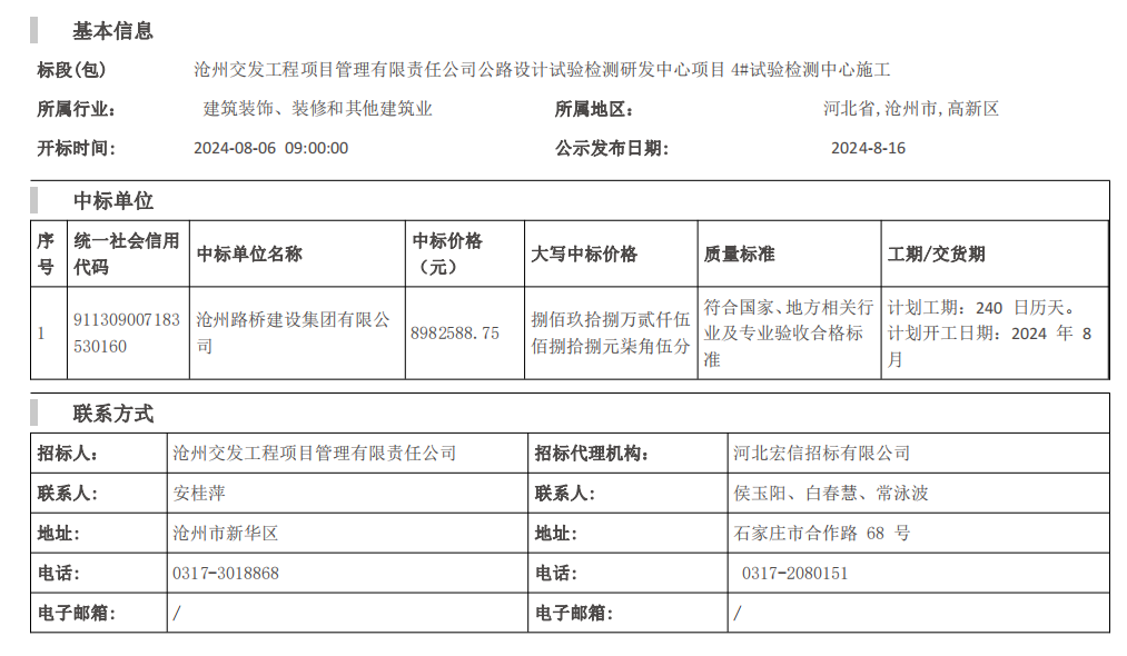 滄州交發(fā)工程項(xiàng)目管理有限責(zé)任公司公路設(shè)計(jì)試驗(yàn)檢測(cè)研發(fā)中心項(xiàng)目 4#試驗(yàn)檢測(cè) 中心施工中標(biāo)結(jié)果公示
