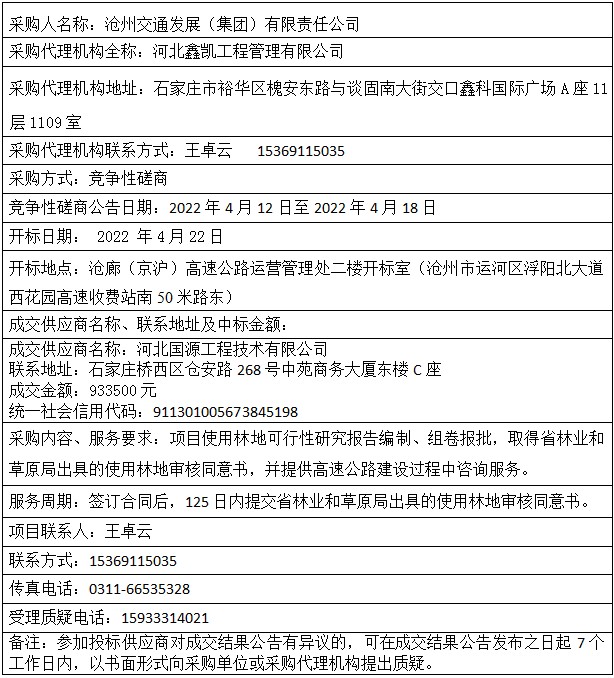 曲港高速公路肅寧互通至京臺高速段(肅寧互通至黃驊港段一期工程)項(xiàng)目使用林地可行性研究報(bào)告編制 成交結(jié)果公告