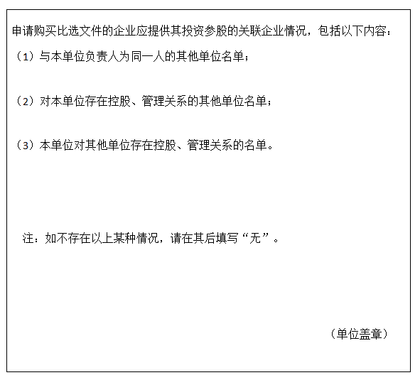 方式:有意向的供應(yīng)商在比選文件發(fā)售時(shí)間內(nèi),由法定代表人或授權(quán)代理人持營(yíng)業(yè)執(zhí)照復(fù)印件(加蓋公章)、資質(zhì)證書(shū)復(fù)印件(加蓋公章)、投資參股的關(guān)聯(lián)企業(yè)情況表原件(格式見(jiàn)附件)、購(gòu)買人的身份證原件、授權(quán)委托書(shū)(法定代表人親自購(gòu)買文件的無(wú)需授權(quán)委托書(shū))原件,到指定地點(diǎn)報(bào)名并購(gòu)買比選文件。