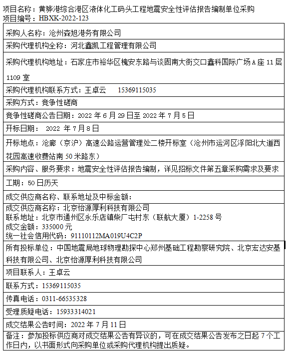 黃驊港綜合港區(qū)液體化工碼頭工程地震安全性評估報告編制單位采購成交結(jié)果公告