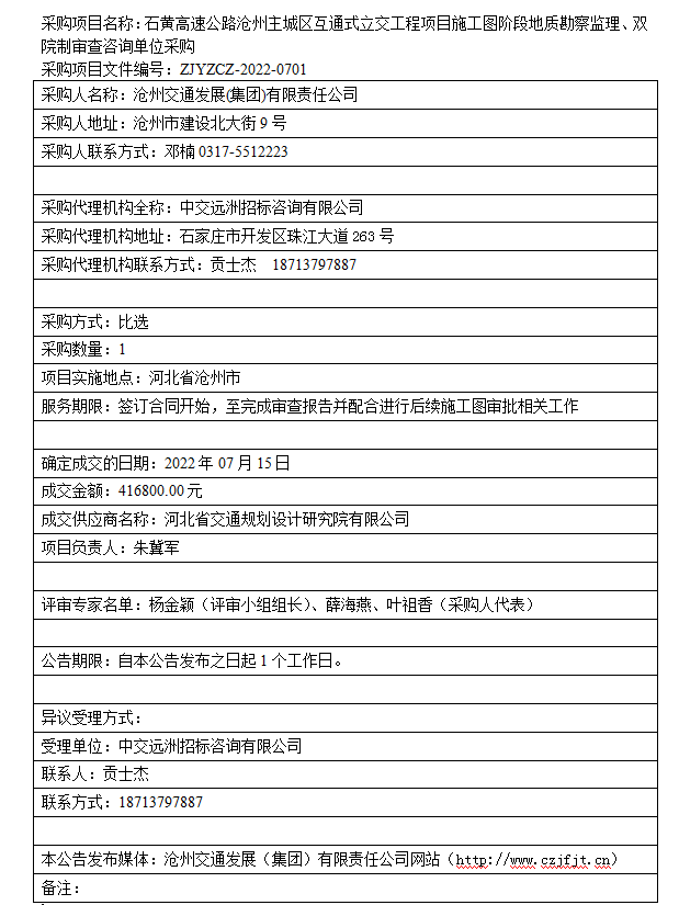石黃高速公路滄州主城區(qū)互通式立交工程項(xiàng)目施工圖階段地質(zhì)勘察監(jiān)理、雙院制審查咨詢單位采購(gòu)成交結(jié)果公告