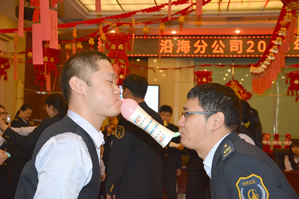 節(jié)目繼續(xù),精彩不斷。吹氣球傳紙杯、搶凳子、一圈到底、面部吃餅干等各式各樣的小游戲讓人輕松愉快、回味無(wú)群。